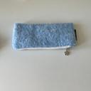 원단은 특이하나 단순한 직사각형 쉐입이기 때문에 예상 외로 가방 속 포인트가 되어주는 아이템은 아 님. 심플함을 선호하나 평범한건 싫은 사람들에게 추천! 실물 색감은 흰끼 도는 사파이어 컬러. 하늘색 필기구와 시각적으로 궁합이 좋다. 꽃 모양의 지퍼 고리가 포인트. 원단은 니트 질감을 기대하며 구입했으나 양모펠트에 가깝다. 두텁고 빳빳해서 내구도가 좋을듯. 모가 단단히 얽혀있어 털빠짐은 전혀 없다. 푸른색 바탕에 반투명한 백색 원단모가 불규칙하게 얼기설기 엉켜있다는 느낌. 매력적인 질감이다. 힘주어 잡아당겨도 탈락되지 않음.