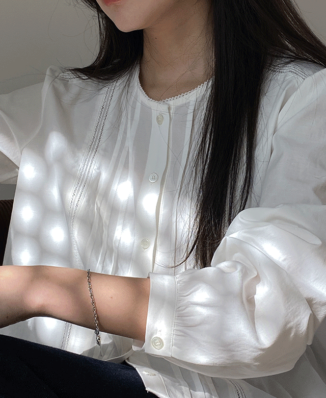 킨다베이지의 조앤 레이스 핀턱 블라우스 (2color) 상품입니다. 현재 가격은 61,000원입니다.