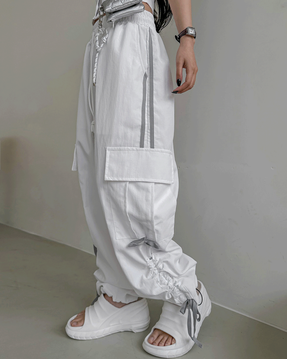 더나이브의 지크 리본 나일론 밴딩 와이드 팬츠 상품입니다. 현재 가격은 66,500원입니다.