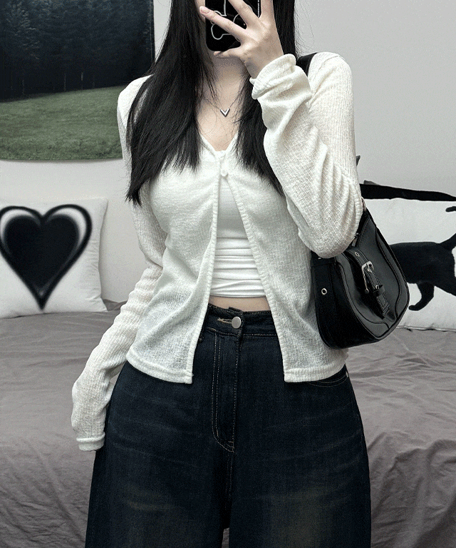 새벽의 [여름가디건/장마룩] see-through two- button slit long-sleeved cardigan 시스루 투버튼 트임 긴팔 가디건 상품입니다. 현재 가격은 19,500원입니다.