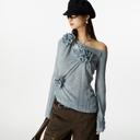 YOSHUYUKI의 YOSHUYUKI 포그블루 플라워 코사지 긴팔 여름 니트 오프숄더 시스루 탑 상품입니다. 현재 가격은 82,000원입니다.