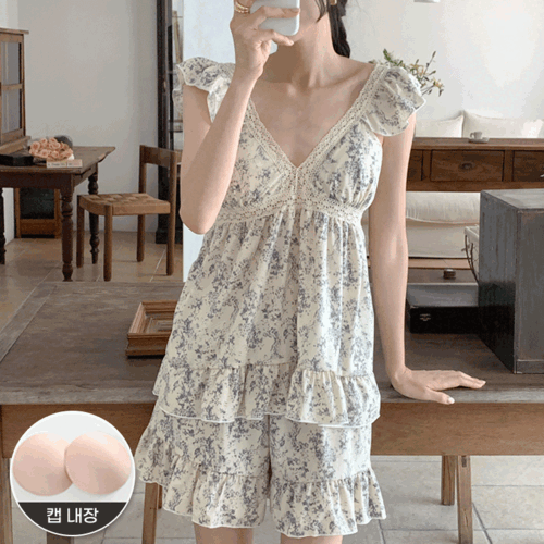 어나더뷰의 어나더뷰 [내장패드/2타입] 웬디 레이스 파자마 상하세트 원피스 홈드레스 우정 캡내장 잠옷 프릴 나시 민소매 no.1945 상품입니다. 현재 가격은 13,900원입니다.