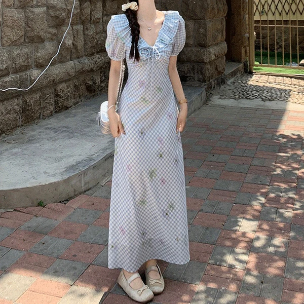 완츄의 [러블리/여름코디] 버블 프릴 체크 브이넥 롱 원피스 상품입니다. 현재 50% 할인 중으로, 22,900원에 구매 가능합니다.