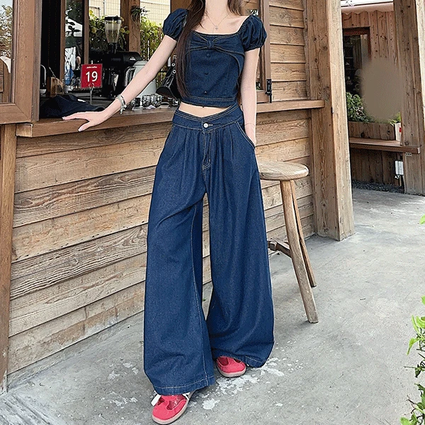 완츄의 [코디걱정X/러블리] 리치 반팔 블라우스+데님 와이드 팬츠 세트 상품입니다. 현재 50% 할인 중으로, 51,900원에 구매 가능합니다.
