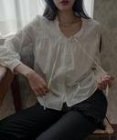 웨이브 셔링 퍼프 블라우스 플라워_화이트
