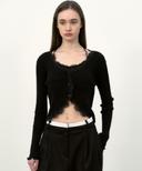 닉앤니콜의 LACE FRILL ESSENTIAL CROP CARDIGAN_BLACK 상품입니다. 현재 10% 할인 중으로, 79,200원에 구매 가능합니다.