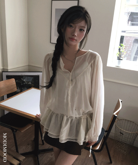 [데일리/봄신상💖] 튤립 브이 레이어드 프릴 셔링 블라우스-2color