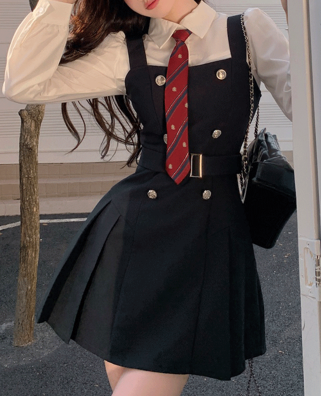 젤리디어의 [하이틴/쓰리피스] 화이트 긴팔셔츠+금장 플리츠 벨트 미니원피스 +오버핏자켓 셋업 세트 놀이공원 코스프레 스쿨룩 교복세트(넥타이포함) 상품입니다. 현재 가격은 79,500원입니다.