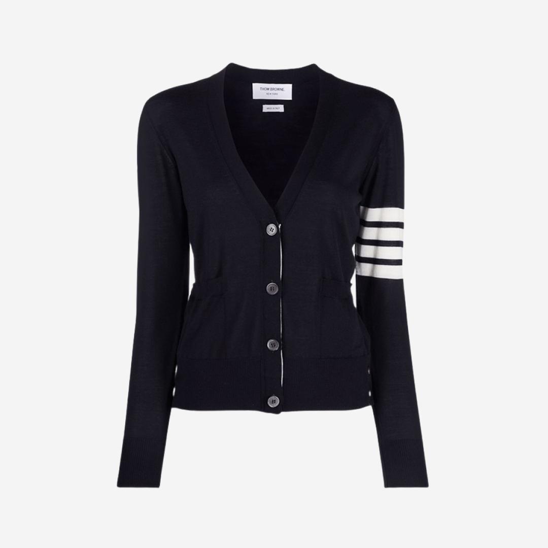 톰브라운의 (W) Thom Browne Sustainable Fine Merino Wool 4-Bar Relaxed Fit V-Neck Cardigan Navy 상품입니다. 현재 가격은 1,100,000원입니다.