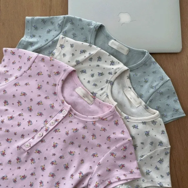 디어코코의 파스텔 버튼 플라워 잔꽃 슬림 여름 반팔 티셔츠 상품입니다. 현재 가격은 32,000원입니다.