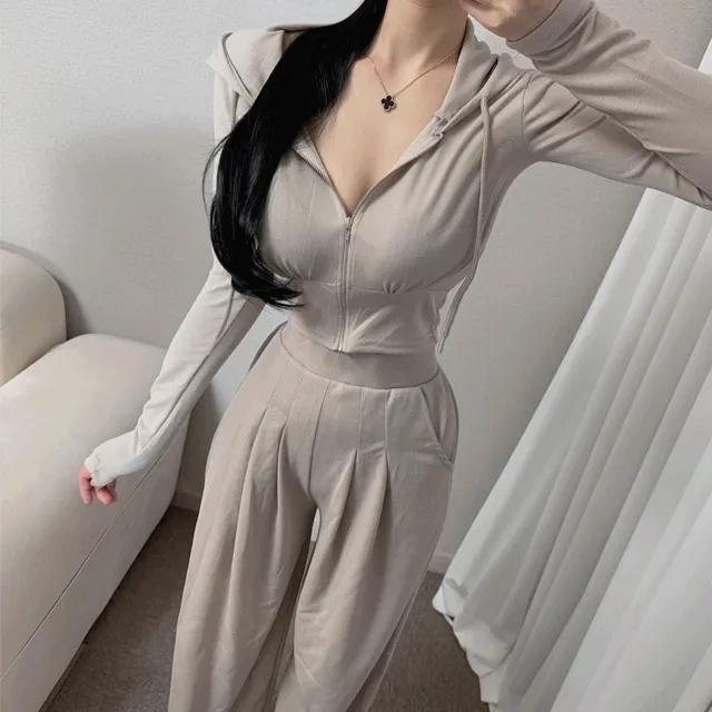 더엔느의 *최저가*[세트가격]허리 쏙 크롭 후드집업 와이드 팬츠 트레이닝세트 투피스 셋업 상품입니다. 현재 21% 할인 중으로, 39,900원에 구매 가능합니다.