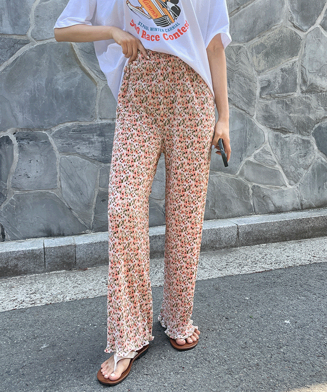 에일런의 플로럴 플리츠 밴딩팬츠 상품입니다. 현재 7% 할인 중으로, 19,000원에 구매 가능합니다.
