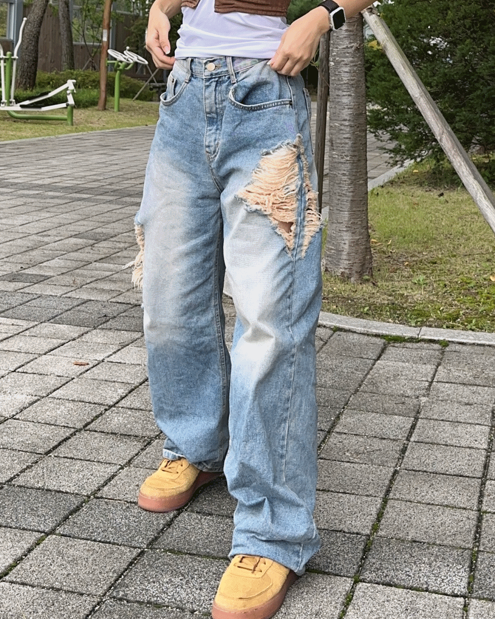듀에스의 [unisex] 코코 구제 빈티지 찢청 와이드 데님 (1 color) 상품입니다. 현재 가격은 46,000원입니다.