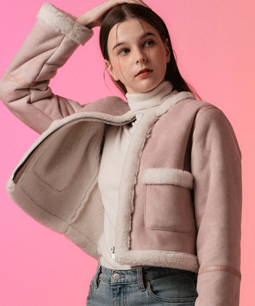 콜릿의 WOMEN 무톤 스웨이드 양털 볼레로 무스탕 자켓 [핑크] 크롭 ver. 상품입니다. 현재 20% 할인 중으로, 158,400원에 구매 가능합니다.