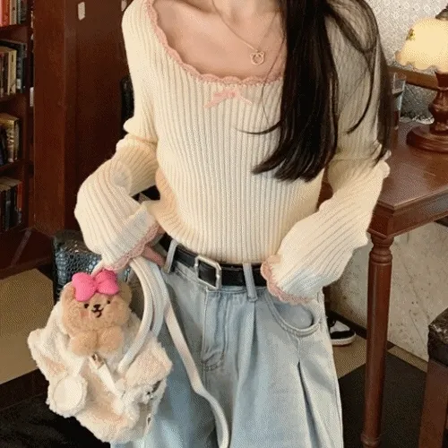 핑크하우스의 [로맨틱 감성] 레이스 포인트 골지 니트 상품입니다. 현재 38% 할인 중으로, 16,300원에 구매 가능합니다.