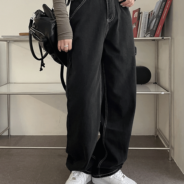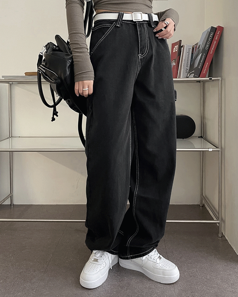 원더원더의 오벤 흑청 스티치 롱 와이드 스트랩 데님 워크 팬츠 상품입니다. 현재 4% 할인 중으로, 24,150원에 구매 가능합니다.
