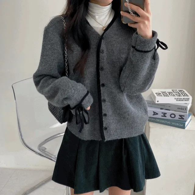데이타임문의 [추가할인/당일발송]도톰 낙낙 러블리 리본 니트 배색 가디건 상품입니다. 현재 30% 할인 중으로, 21,000원에 구매 가능합니다.