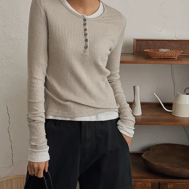 비에브의 [기획특가] 모달 버튼 베이직 레이어드 골지 티 - 4 color 상품입니다. 현재 21% 할인 중으로, 24,500원에 구매 가능합니다.