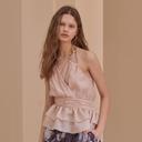 까이에의 홀터넥 랩 스타일 2단 페플럼 블라우스_핑크 베이지 상품입니다. 현재 가격은 398,000원입니다.