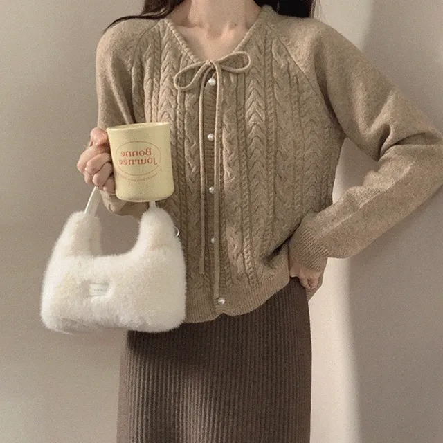 룩앤무드의 이브 울 꽈배기 진주 리본 니트 볼레로 가디건 상품입니다. 현재 10% 할인 중으로, 25,200원에 구매 가능합니다.