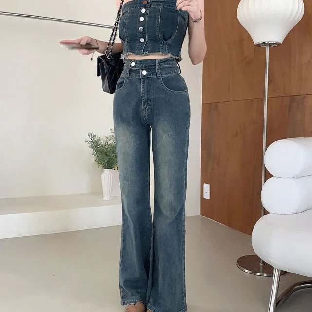 유메라의 [ set구성 / 3size ] 시티 데님 뒷밴딩 튜브탑 와이드 팬츠 세트 상품입니다. 현재 5% 할인 중으로, 58,900원에 구매 가능합니다.
