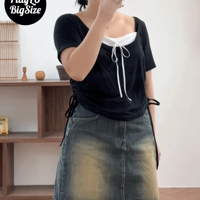 플레이루의 빅사이즈 리본 배색 스트링 셔링 반팔 티셔츠 -3color 상품입니다. 현재 가격은 28,800원입니다.