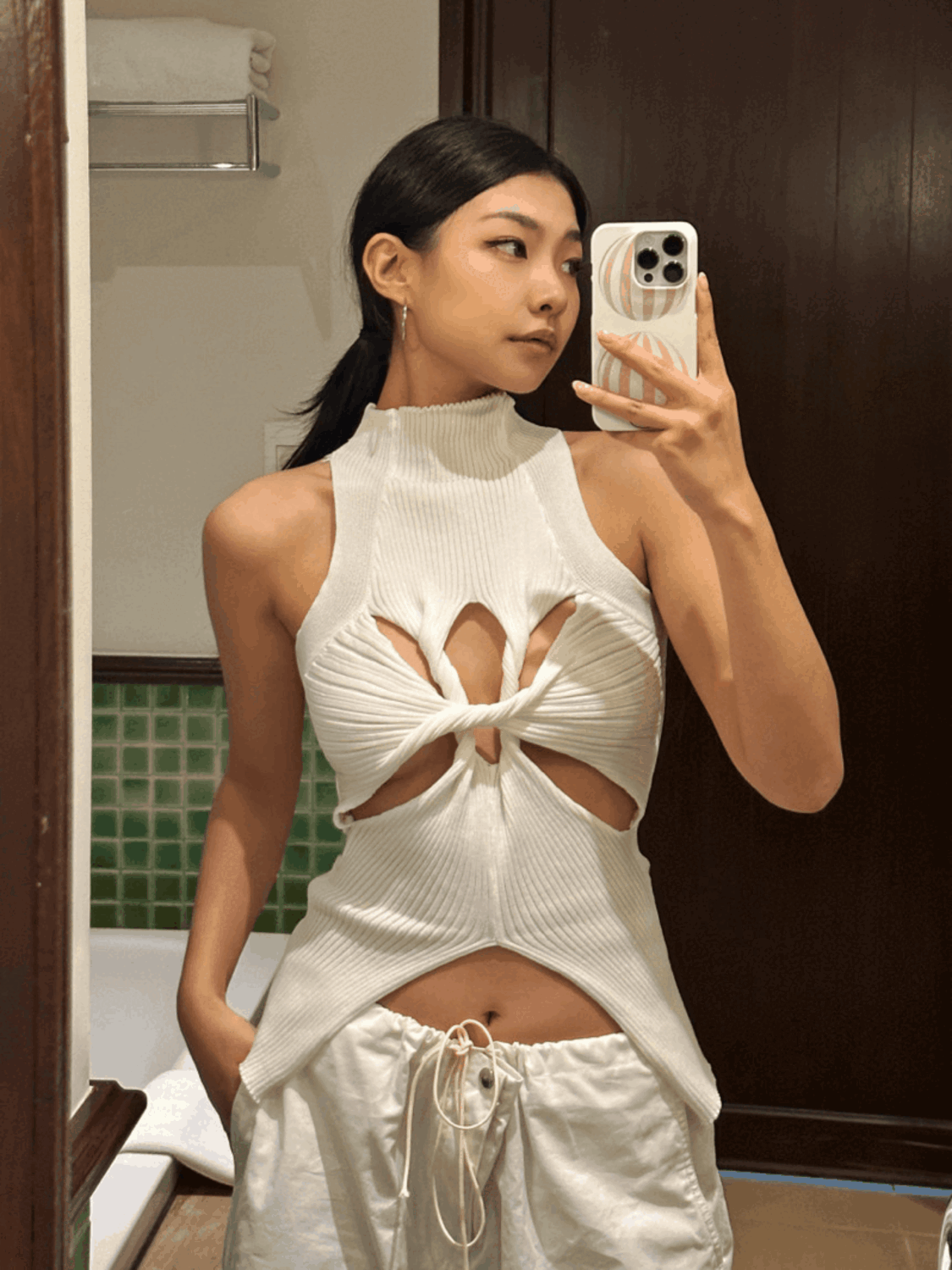 드로우어텐션의 [무배/당일출고] 크로스 컷아웃 반폴라 골지 나시 상품입니다. 현재 30% 할인 중으로, 21,000원에 구매 가능합니다.
