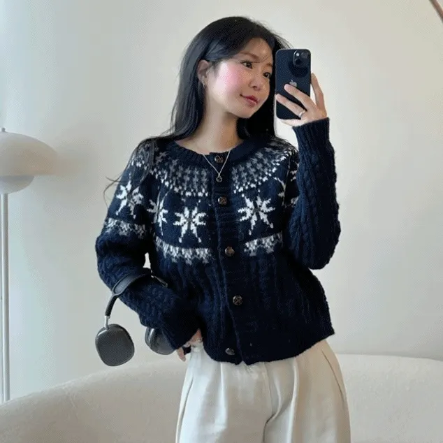 데일리유의 [겨울/빈티지무드❄] 라일,눈꽃 노르딕 도톰 라운드 니트 긴팔 가디건 [2color] 상품입니다. 현재 28% 할인 중으로, 23,800원에 구매 가능합니다.