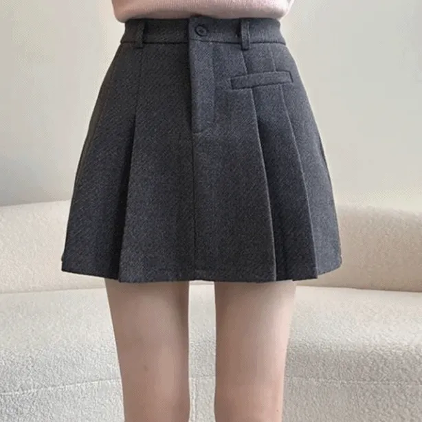 데일리유의 [모직소재💭/러블리/겨울] 미즈,모직 원버튼 포켓 플리츠 미니 스커트 [2color] 상품입니다. 현재 34% 할인 중으로, 19,900원에 구매 가능합니다.