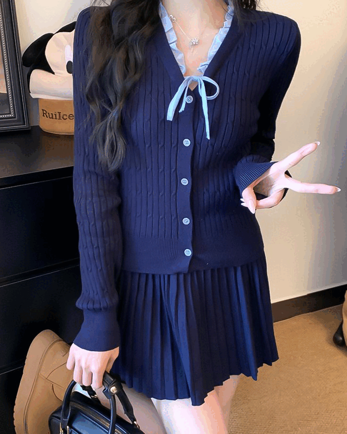 끌앤끌의 세로 스트라이프 니트 플리츠 스커트 세트 상품입니다. 현재 가격은 16,900원입니다.