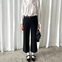 PFFGIRL 의 PFF GIRL 블랙 슬랙스 밑단 레이스 부츠컷 9부 울 팬츠 상품입니다. 현재 가격은 140,000원입니다.