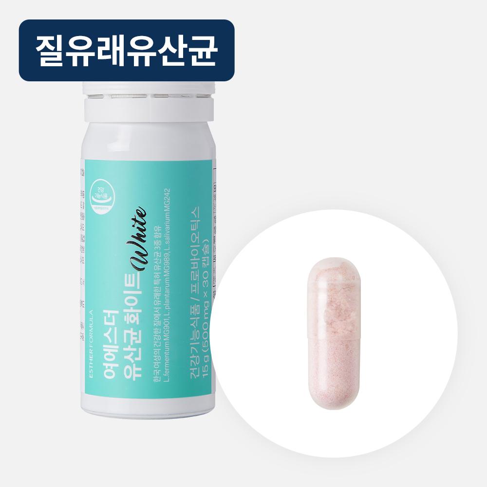여에스더의 질유래 유산균 화이트 상품입니다. 현재 40% 할인 중으로, 21,600원에 구매 가능합니다.