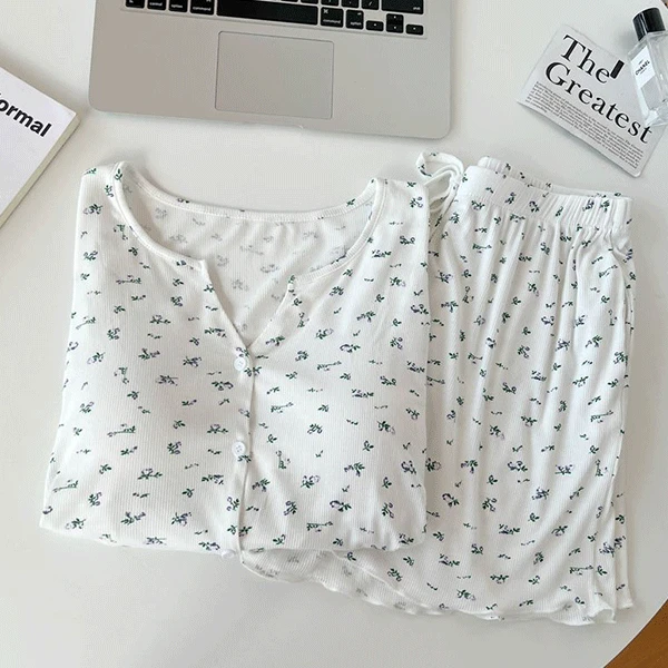 온더무드의 [캡포함] 플로럴 브이넥 여름 반팔 잠옷 세트 상품입니다. 현재 50% 할인 중으로, 10,000원에 구매 가능합니다.