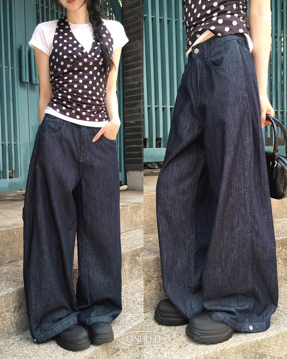 온디드의 온디드 [쿨여름데님🧊/기장선택] 칸즈 생지 핀턱 스냅 와이드 데님 팬츠 상품입니다. 현재 31% 할인 중으로, 23,300원에 구매 가능합니다.