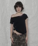 어니브의 UNBALANCE PIERCING EYELET T-SHIRT BLACK 상품입니다. 현재 30% 할인 중으로, 39,200원에 구매 가능합니다.