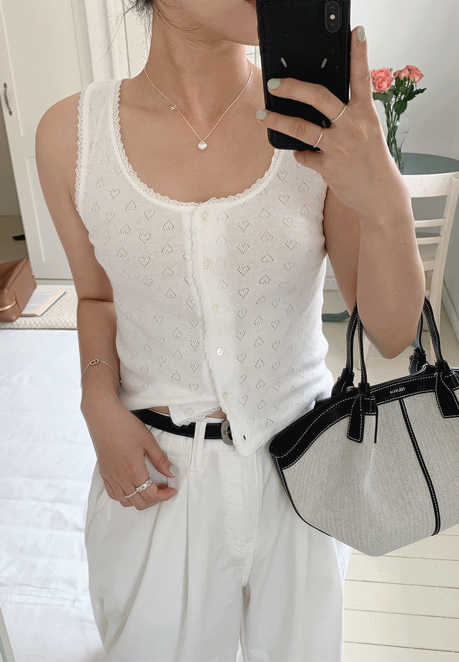 에오브의 테니 하트 펀칭 여름 버튼 나시 티셔츠 3color 상품입니다. 현재 가격은 39,500원입니다.