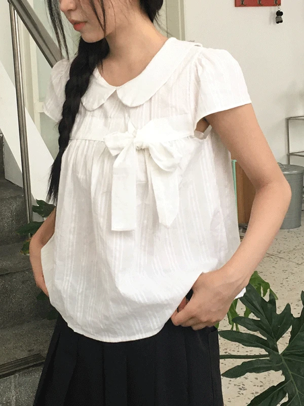 시프트에잇의 [캡소매/널널여리핏♥] 루카 둥근카라 뒷단추 체크 리본 블라우스 2color 상품입니다. 현재 9% 할인 중으로, 20,900원에 구매 가능합니다.