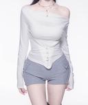 오아이때의 스냅버튼 보트넥 코르셋 오프숄더티 상품입니다. 현재 가격은 28,500원입니다.