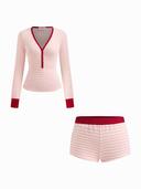 사이다 CIDER의 V-neck Stripe Contrasting Binding Long Sleeve Top & Mid Rise Shorts Loungewear Set 상품입니다. 현재 가격은 39,900원입니다.