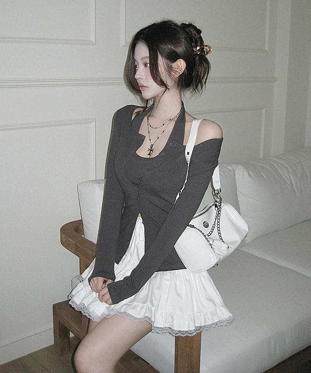 클래식블랑의 [레이어드일체형🤎] 헤이즈 홀터넥 레이어드 일체형 가을 긴팔 가디건 티셔츠 / 오프숄더티 데이트룩 데일리룩 클래식블랑 상품입니다. 현재 29% 할인 중으로, 30,800원에 구매 가능합니다.