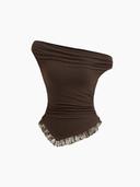 사이다 CIDER의 Asymmetrical Neck Lace Trim Ruched Top 상품입니다. 현재 가격은 27,900원입니다.